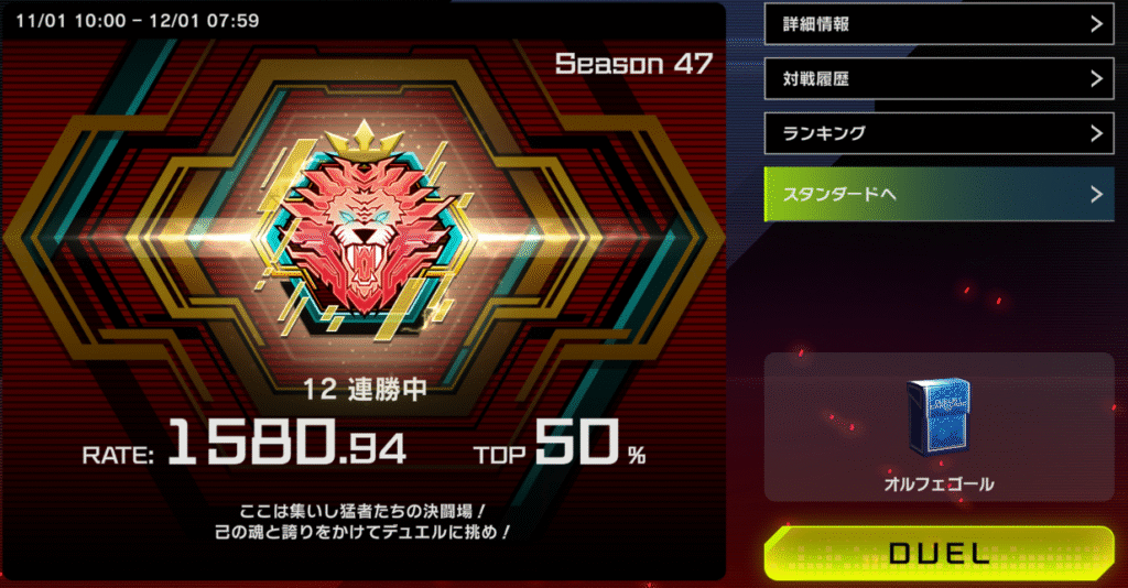 11月21日なのでレート低めですが、一応12連勝しました。ちなみに先攻5回、後攻7回です。